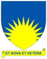 Escutcheon: Or, a chevron between three crescents Azure; on a canton of the last the Roman letters IHS between in chief a Passion Cross and in base three passion nails pilewise, all of the first. |