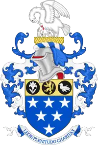 Escutcheon: Azure, six mullets, three, two and one, argent; on a chief Or three pellets, the centre one charged with a lion rampant of the third, the dexter with a lily and the sinister with a swallow both of the second. |