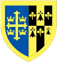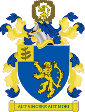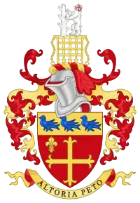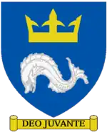 Escutcheon: Argent, on a cross Azure three crowns Or in fess and two escallops of the first in pale, in the first quarter a lion rampant reguardant of the second. |