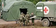 The Army Medical Service (German: Sanitätsdienst Heer or Sanitätsdienst des Heeres[1]) is a non-combat specialty branch of the German Army traditionally responsible for providing medical services within the army, and which has a humanitarian function during armed conflicts in accordance with international humanitarian law, and specific rights and responsibilities under the Geneva Conventions, their additional protocols and customary international humanitarian law. It is entitled under international humanitarian law to use the red cross as a protective sign and its personnel are protected persons under international humanitarian law.[2] Since 2002, most of its former responsibilities have been transferred to the Joint Medical Service. The Army Medical Service still exists as a small entity within the German military.