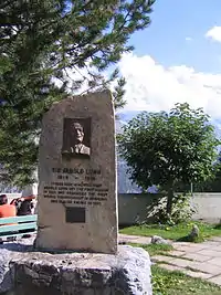 Memorial to Arnold Lunn in Mürren, Switzerland. The text reads, "It was here in Mürren that Arnold Lunn set the first slalom in 1922 and organised the first world championship in downhill and slalom racing in 1931."