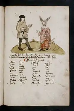 Page of Arnold von Harff's book, with the Breton-low German vocabulary with a drawing of the way Nantes people were dressed