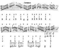 In most settings Schlick uses mixed notation: the upper part is notated mensurally, while the lower parts are given in tablature.[49] The practice was rarely used in Germany at the time, but it appears in many contemporary French and Italian sources, such as collections of frottolas by Franciscus Bossinensis (1509–1511) or Marchetto Cara (c. 1520), and Pierre Attaingnant's publications (late 1520s).[50] Another important deviation from the German norm is Schlick's tendency to put the cantus firmus in the highest part, the discantus, whereas the norm for German Lieder was cantus firmus in the tenor.