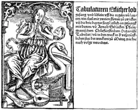 The Tabulaturen etlicher lobgesang is the earliest extensive source of German lute music and also one of the earliest published collections of lute music known.[44] There are fifteen lute pieces, twelve of which are duets for voice and lute. The pieces are organized by difficulty, which reflects the didactic aspect of the Tabulaturen.[45] Curiously, Schlick does not include performing instructions, which are commonplace in most later German publications,[45] and furthermore, no texts are included, although most can be found in contemporary sources—there are just three songs unique to the Tabulaturen (Mein lieb ist weg, Philips zwolffpot and All Ding mit radt). Almost all the songs are settings of German polyphonic Lieder on secular texts. There are two exceptions. The first, Metzkin Isaack, may be of Netherlandish origin, and there is a possibility that Schlick learned the piece from Petrucci's Harmonice Musices Odhecaton. This would imply that Schlick borrowed the idea to apply for an imperial privilege for Spiegel and Tabulaturen from Petrucci.[46] The second exception is All Ding mit radt, which is different from every other piece in the Tabulaturen: it relies not on the phrase structure of the song, like other settings, but rather on motivic and harmonic principles. Also, unlike other lute settings, it does not use bar form.[47]