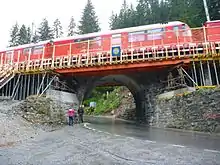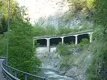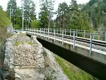 A comprehensive renovation of the Clasaur Tobel Viaduct, which runs directly into the tunnel of the same name, was also carried out in 2011. Permanent changes in the slope led to severe damage to this hard to reach structure. The deformed stone arches were demolished down to the foundations and were replaced by three new steel towers. The construction work was completed in autumn 2011.[14] The two stone arch bridges over the Schanfiggerstrasse between Litzirüti and Arosa (Rütland bridge (2012) and Bodenwald viaduct (2013)) were replaced by three-span concrete girder bridges. This work also improved the traffic flow on the cantonal road. The reconstruction costs for the Rütland bridge amounted to CHF 1.9 million, 85% provided by the Federal Government.[15] The costs incurred for the Bodenwald Viaduct was estimated at CHF 2.1 million.[16]