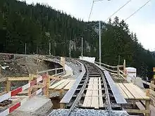 Also in 2013, the Äber (in Swiss German; Eber in German) gallery was demolished above Sassal and replaced by rockfall nets.[26] In time for the 100th anniversary of the Arosa Railway, Arosa station was rebuilt with work completed in December 2014 at a cost of more than CHF 24 million. The extensive modernisation was carried out in cooperation by the RhB, the canton of the Grisons, the municipality of Arosa and Arosa Bergbahnen AG.[27][28]