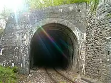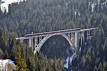The rest of the line contains many civil engineering structures, including a total of 41 bridges,[2] 19 tunnels and 12 avalanche-protection galleries. The largest structures are the Langwieser Viaduct, the Gründjitobel Viaduct—both in the territory of the former municipality of Langwies—and the Castielertobel Viaduct between Calfreisen and Castiel. The longest tunnel is the 399 m-long Lüener Rüfe tunnel.