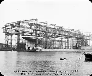 The Belfast gantry was commissioned by the White Star Line[3] and Harland and Wolff and built by Sir William Arrol & Co. in 1908.[4] It was 840 feet (260 m) feet long, 270 feet (82 m) feet wide and 228 feet (69 m) feet high.[4][5] It was an essential part of the infrastructure needed for the construction of the RMS Olympic and RMS Titanic and remained in use until it was demolished in the 1960s to create space for storage and car parking.[6]