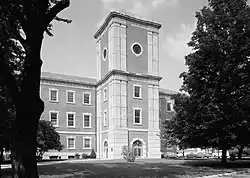 The Arsenal building, also known as the Main building, was constructed in 1864. It is a three-story building which originally served as a storehouse. Wagons would pull up under the seven-story tower and be hoisted up by a platform lift. Once in place, rifles, cannon, or other materiel was unloaded at the appropriate floor.[6]