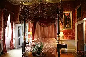 - The North State Bedchamber: Is 20 feet (6.1 m) square. The fireplace is of white marble, the side pilasters carved with shallow reliefs of eagles, patera and other motifs, the frieze is of a darker white-veined marble with carved central plaque and meander of white marble. The ceiling has a rich entablature, the frieze decorated with palmettes, the centre of the ceiling has a circle outlined by a richly molded plaster beam. The dado, ceiling and door surrounds are white highlighted in gilt. There is a table with a top made from a mosaic bought as originating from Hadrian's Villa, now believed to be an 18th-century copy. The four-poster bed is Regency. The walls are covered in patterned red velvet.