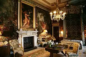 - The Venetian Room: Is 18 by 24 feet (7.3 m), is the main guest bedroom and is the central room on the north side of the wing. The fireplace is of black marble with white veins, the carved frieze of white marble has a plain central plaque of green marble with mottling. The plaster decorative overmantel has an open pediment and surrounds an oval portrait. Two doors flank the fireplace with two more on the side walls near the window, all have entablatures with decorative frieze and surmounted by portraits. The ceiling has a rich entablature with a rinceaux frieze, and plaster beams dividing the ceiling into various geometric shapes. The window Venetian with central Corinthian columns and matching pilasters. The walls are covered by 18th-century tapestries with a pastoral theme with playing cupids. There is a gilt wood chandelier.
