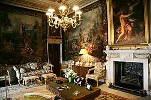 - The State Sitting Room: Is 27 by 15 feet (4.6 m). The fireplace with shallow carvings of dark green marble with white veins, the frieze of onyx with a plain central plaque of polished red granite. The dado, ceiling and door surrounds are white highlighted in gilt. The walls are covered by 17th-century Brussel's tapestries designed by Peemans, depicting the twelve months of the year. There is a Kent sofa and arm-chairs covered in red velvet and a pair of torchieres.