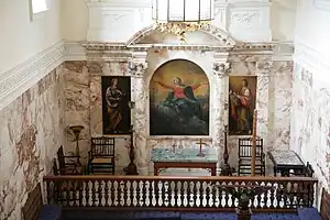 - The Chapel: the east wall above the altar, Guido Reni's The Assumption of the Virgin flanked by Giovanni Battista Cipriani's paintings of St. Anne and St. Cecilia; in the west gallery, Maratta's Virgin Holding a Book and a 16th-century Head of Christ by an unknown painter of the Milanese School; above the fireplace Giorgio Vasari's portrait of Pope Leo X, Bernardino Luini's Holy Family with St John the Baptist, Mazzuola's Penitent Magdalen, and in the manner of van Dyke Archbishop Laud; on the south wall, Preti's The Adoration of the Magi, Andrea Sacchi's Abraham, Hagar and Ishmael, Lanfranco's The Angel appearing to Joseph; on the north wall, Carlo Maratta's The Virgin reading with St. John and Pietro da Cortona's A scriptural piece from the history of Jacob.