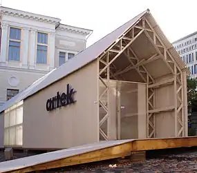 In 2007, Japanese architect Shigeru Ban designed an exhibition pavilion for Artek, built from reconstituted waste material provided by the Finnish paper manufacturer UPM. The pavilion was first used at the Milan Triennale in 2007, after which it was temporally in use outside the Design Museum, Helsinki.
