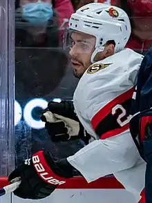 Zub's play in the KHL and the Olympics attracted the attention of the National Hockey League (NHL)'s Ottawa Senators. On 1 May 2020, the Senators signed him to an NHL-standard entry-level contract as an undrafted free agent for one season.[7] He scored his first NHL goal in a 6–5 overtime win against the Toronto Maple Leafs on 15 February 2021 at the Scotiabank Arena in Toronto.[8] In his first season, he was regularly paired on defence with Ottawa's top defenceman Thomas Chabot.[9] Upon joining the Senators he quickly solidified himself in the team's defence, seen as the Senators' best defensive defenceman.[10]