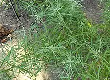 The gray-green aromatic foliage is made up of long, narrow leaves deeply cut into several narrow, pointed lobes.[10]