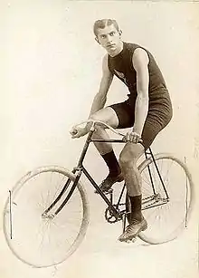 He began cycle-racing at 17 on a penny-farthing, a traditional bicycle on which he sat above a 55-inch wheel, a smaller wheel following. He abandoned that in 1891 for a Star bicycle, which had the larger wheel at the back and was propelled by pedals to be pushed up and down.[5] A further novelty was that both pedals could be brought to the top of the pedaling stroke at the same time, which the makers claimed gave better acceleration. He won the League of American Wheelmen national half-mile championship, setting a world record of 29.5 seconds for the last 440 yards.[4]