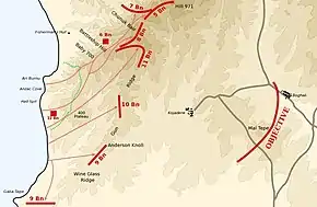 In mid-June, the battalion was committed to the Syria–Lebanon campaign against the Vichy French in the French Mandate for Syria and the Lebanon. Due to the involvement of Vichy French and Free French troops on opposite sides, the campaign was politically sensitive and as a result of heavy censorship not widely reported in Australia at the time; the nature of the fighting, where it was reported, was also played down as the Vichy forces outnumbered the Allies and were also better equipped.[90][91] The Allied plan involved four axes of attack, with the 7th Division committed mainly to the coastal drive on Beirut in Lebanon and the central thrusts towards Damascus in Syria.[92] Blackburn initially divided his time between divisional headquarters in Palestine and the front, while three companies of the 2/3rd, along with a battery of anti-tank guns, were the only divisional reserve.[93]