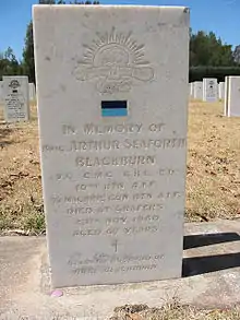 He married Rose Ada Kelly at the St Peter's College chapel on 22 March 1917;[lower-alpha 2] they had two sons and two daughters.[45] Their sons were Richard and Robert;[54] Richard also became a lawyer and eventually became an eminent jurist, chief justice of the Supreme Court of the Australian Capital Territory and chancellor of the Australian National University.[55] His daughter Margaret married Jim Forbes, who became a long-serving federal government minister,[56] and his other daughter Rosemary became a literary editor, author, and adviser to the South Australian government on women's affairs.[57] Blackburn was discharged from the AIF on medical grounds on 10 April 1917,[1][58] as he was classified as too ill to return to the fighting. He was awarded an invalid soldier's pension.[52] In addition to his VC, Blackburn also received the 1914–15 Star, British War Medal and Victory Medal for his service in World War I.[59][60] His brothers Harry and John also served in the AIF during the war.[59]