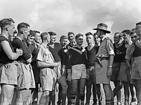 Blackburn stopped practising law in 1940,[1] and on 20 June was appointed to raise and command the 2/3rd Machine Gun Battalion, part of the Second Australian Imperial Force raised for service overseas during World War II.[59] He was one of only three Australian World War I VC recipients to volunteer for overseas service in World War II.[84] Eleven of the officers selected by Blackburn for his new unit were former officers of the 18th Light Horse (Machine Gun) Regiment, including the battalion second-in-command, Major Sid Reed, who was to prove valuable in moderating Blackburn's temper at times. The unit was raised in four different states; headquarters and A Company in South Australia, B Company in Victoria, C Company in Tasmania and D Company in Western Australia.[85] It concentrated in Adelaide on 31 October, after which Blackburn moulded the separately raised companies into one organisation. Multi-day route marches featured strongly in their training; Blackburn invariably marched at the front of his battalion.[86] After undergoing training, the battalion entrained for Sydney where it embarked on SS Ile de France on 10 April 1941. The battalion sailed for the Middle East via Colombo, where they had ten days' leave, and disembarked in Egypt on 14 May.[59][87] Upon arrival, the battalion was assigned to the 7th Division in Palestine, where it underwent further training[88] at a camp just north of Gaza.[89]