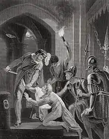 After King John had captured Arthur and kept him alive in prison for some time, at length, in the castle of Rouen, after dinner on the Thursday before Easter, when he was drunk and possessed by the devil ['ebrius et daemonio plenus'], he slew him with his own hand, and tying a heavy stone to the body cast it into the Seine. It was discovered by a fisherman in his net, and being dragged to the bank and recognized, was taken for secret burial, in fear of the tyrant, to the priory of Bec, which is called St Mary of the Meadow.[10][11]