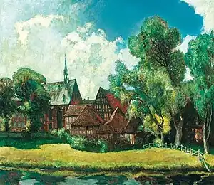 In 1908, he became a lecturer at the Staatliche Kunstgewerbeschule (now the University of Fine Arts), for a newly established nude drawing course.[2] During World War I he was exempted from compulsory military service, but went to the front for three months in 1916, on behalf of Otto Lauffer, Director of the Museum for Hamburg History, to make sketches that were exhibited in 1918. After the war, he focused on religious painting. During the following years, Anti-Semitic sentiments began to appear in his personal letters. He became a member of the Militant League for German Culture in 1928, and joined the Nazi Party in 1933.[3] As a result, he was dismissed from his teaching position and moved his family to Lüneburg.