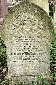 He is also commemorated on the family grave of his grandparents on the west side of Highgate Cemetery.