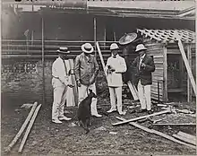 The former British and French concession Shamian Island (then known as Shameen) however is completely intact, and hosts a number of designs by the firm, as well as alterations such as extra floors.[3] They include the Imperial Maritime Customs Building (eastern end of Central Shamian Street on the north side, with a pair of 'witches hat' towers, 1907), Griffith & Co (south west corner of North Shamian and Third Streets, c1905), Karberg & Co, (50 South Shamian Street, 1908),[4] International Banking Co (end of Central Shamian on the north side, 1908), Deacon & Co (northwest corner of Central Shamian and Fifth, 1908).[2] All of the designs were generally in the Far East British Colonial form known as 'compradoric', featuring multi-level verandahs supported on solid pillars or arches, with Italianate or Edwardian Baroque detailing.