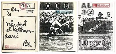 Between 1983 and 1985 Artpool published 11 issues of Aktuális Levél (Artpool Letter),[29][30][31] an underground (samizdat) art magazine which was an important source on the parallel culture of that time in Hungary.[1] Produced with a photocopier in 300-500 copies Artpool Letter released documents, reports, and interviews on local as well as international art events. Artpool also issued a thematic cassette series distributed through international exchange under the name Artpool Radio.[32][33]