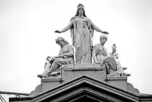 The Arts and Industries Building was sited slightly farther back from the Mall than the Smithsonian Castle to avoid obscuring the view of the Castle from the Capitol.[4] The building was designed to be symmetrical, composed of a Greek cross with a central rotunda. The exterior was constructed with geometric patterns of polychrome brick, and a sculpture entitled Columbia Protecting Science and Industry by sculptor Caspar Buberl was placed above the main entrance on the north side.[4]