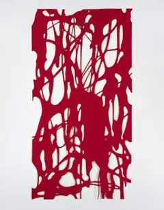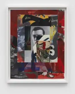 In later exhibitions, Herrera has pushed in the direction of more complex work, often privileging form over concept and movement (bodily and formal) with references to dance and music.[36][39][1] His exhibition at Sikkema Jenkins & Co (2014) centered on layered, sometimes disorienting, abstract hybrids of painting, collage and assemblage that included second-hand books blurred, dragged and dipped with paint and cutout pieces revealing layers sandwiched with sheets of silk-screened aluminum and found objects such as hemp tote bags.[57][36] Roberta Smith described the work as more personal, experiential and riskier, exploring new "materials, processes and previous lives, while parsing the tensions between physical fact and visual effect."[36] In his 2017 show at the same gallery, Herrera applied similar visual strategies to the painted canvas for the first time, free of collage elements.