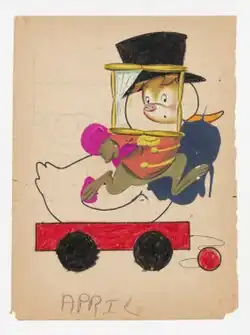 Herrera's early work centered on small, handcrafted series of collages in which he cut, layered and intertwined fragments from coloring books, advertisements, cartoons and fairy tales with painterly marks and abstract shapes.[31][9][8] These images were often bizarre hybrids: Donald Duck's lower torso morphing into a Häagen-Dazs ice cream bar in a coloring book landscape; an upside-down, scribbled-over Tweety seeing a teddy bear flattened by a Wonder Bread wrapper and a phallus-shaped cutout.[8][31] The splicing and destruction of the original material subverted its childhood innocence, evoking darker, provocative realms of the unconscious alluding to violence and sexuality.[4] New York Times critic Holland Cotter wrote of Herrera's "Desire" collages (Drawing Center, 1994): "polymorphously perverse and sweet, they seem to come from the hand of a child still too naive to disguise the depths of his own aggression."[31] Herrera involved viewers directly in the web project Almost Home (Dia Center, 1998), which used an interactive, diptych format to pair collages (some animated) from a series of 100 collages in playful, chance juxtapositions.[29][43]