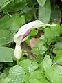 The plain green leaves of A. cylindraceum appear in early spring (late March–early May) followed by the flowers borne on a poker-shaped inflorescence called a spadix, which is partially enclosed in a grass-green spathe or leaf-like hood. The flowers are hidden from sight, clustered at the base of the spadix with a ring of female flowers at the bottom and a ring of male flowers above them. Above the male flowers is a ring of hairs forming an insect trap. Insects are attracted to the spadix by its faecal odour and a temperature warmer than the ambient temperature. The insects are trapped beneath the ring of hairs and are dusted with pollen by the male flowers before escaping and carrying the pollen to the spadices of other plants, where they pollinate the female flowers. The spadix is pale chocolate brown to dark purple.[1]