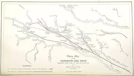 During the middle of the nineteenth century, Carr, Tagore and Company transported coal from Narayankuri ghat on the Damodar River to Kolkata, then known as Calcutta. However, as the flow of water in the river was inconsistent, supplies were irregular. In order to capture the lucrative coal transport business, East Indian Railway, extended the railway track that had been laid between Kolkata and Hooghly to Raniganj in 1855 and up to Asansol in July 1863.[10][11][12]