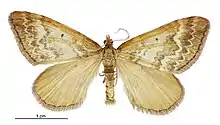 The expansion of the wings is 1 inch. All the wings are pale ochreous ; the fore-wings have a slender brown transverse line at the base, then a large loop-like marking from the costa, almost meeting a smaller, similarly looped marking from the dorsum ; next a broad irregular dark brown band a little beyond the middle, considerably indented towards the termen ; this is followed by a rather narrow pale band, and then by a narrow brown band, also indented towards the termen ; there is a small oblique brown mark below the apex, and a terminal series of black dots. The hind-wings have several faint dusky transverse lines near the base, a row of small spots near the termen, and a terminal series of minute black dots. The cilia of all the wings are reddish-ochreous.[5]