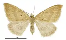 Male, female. — 28-30 mm. Head, palpi, antennae, and thorax very pale brownish-ochreous. Abdomen ochreous-grey-whitish. Legs whitish-ocbreous, anterior femora and tibiae dark fuscous above. Forewings with costa gently arched, posteriorly more strongly, hindmargin slightly bowed, rather oblique ; very pale glossy brownish-ochreous ; four series of minute black dots on veins ; first near base ; second at 1⁄3, curved ; third from 3⁄4 of costa to 2⁄3 of inner margin, rather prominent in middle, preceded by a cloudy fascia slightly darker than ground-colour ; fourth subterminal ; a minute black discal dot ; hindmarginal space sometimes slightly darker : cilia whitish-ochreous, tips paler. Hindwings ochreous-grey-whitish ; a cloudy indistinct pale fuscous hindmarginal fascia, containing a dentate subterminal line of ground-colour ; cilia pale whitish-ochreous.[3]