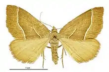 Superior wings ochreous-yellow, suffused with blackish ; the only markings are two distant lines, the first forming a single angle in the cellule, the second simply wavy, these lines are slender, white, narrowly bordered with black on the costa, where they approach nearer one to the other, and followed by a brownish tinge ; extremity of the fringes finely marked with white ; inferior wings ochreous-yellow, without markings above, but beneath they are powdered with red, and traversed by six parallel lines, of which the four first are placed close together and discoidal, the two others isolated and toothed. Body concoloroua, without markings. Antennas of the male furnished with long pubescent and spatulated pectinations.[5]