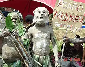 The "Mudmen" of Papua New Guinea's Asaro tribe, also known as the Holosa, are those who wear a traditional costume centered around masks made of mud. They live nearby the village of Goroka in the Eastern Highlands Province of Papua New Guinea.[1]