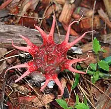 Aseroe rubra, commonly known as the anemone stinkhorn, sea anemone fungus and starfish fungus, is a common and widespread basidiomycete fungus recognizable for its foul odour of carrion and its sea anemone shape when mature. Found in gardens on mulch and in grassy areas, it resembles a red star-shaped structure covered in brownish slime on a white stalk. It attracts flies, which spread its spores.[1][2]