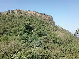 The nearest town is Manor which is 80 km from Thane. The fort lies between Mastan naka and Charoti naka. There are local rickshaws available from either nakas to reach the base village Khodkona खडकोना. There are good hotels at Mastan Naka and Charoti Naka. Now tea and snacks are also available in small hotels on the Highway. The trekking path starts from the hillock north of the Khodkona. The route is very safe and wide. There is a dense forest on the trekking route. It takes about an hour to reach the col below the fort hill. The narrow path climbing up on the eastern side of the hill leads to the entrance of the fort.[3] The night stay on the fort can be made in the cave on the fort. The local villagers make night stay and food arrangements at a reasonable cost.