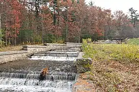 Ashland State Park is located off West Union Street in southern Ashland, a rural outer suburb west of Boston. Its centerpiece is the former Ashland Reservoir, with the dam and spillway at its northern end. From that point, Cold Spring Brook flows north to join a branch of the Sudbury River. The dam is an earthen embankment, built 83 feet (25 m) above bedrock and 54 feet (16 m) above the level of the reservoir. There is a concrete core wall about 8 feet (2.4 m) thick at the bottom and 2.5 feet (0.76 m) at the top. The spillway lies at the eastern end of the dam, and is constructed of granite rubble, and a series of steps made of granite laid in concrete. The spillway is 630 feet (190 m) long, and is naturalistically designed to resemble a brook descending through landscape. The dam was originally topped by a gatehouse; it was demolished in 1976 after repeated vandalism.[2]