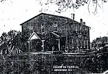 From 1857 until 1869, the Coles County Poor Farm was located in Charleston Township near the small town of Loxa, Illinois. In 1870, the county purchased 260 acres from A. N. Graham in Section 35 of Ashmore Township for a new farm, which was crossed by the Indianapolis & St. Louis Railroad. A small timber and brick building, constructed by H. B. Truman, was the first on that property. It was 38 x 58 feet and two storeys tall, with an attached kitchen. The initial Superintendent or "Overseer of the Poor" of the county farm was Oliver D. Hawkins, who had migrated in 1841 to Coles County from Kentucky.[1]