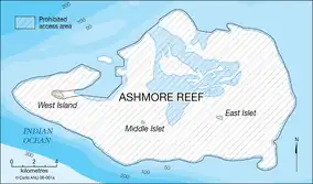 Map showing the Ashmore Reef Marine Park. The shaded area is a Sanctuary Zone ('no take' zone).[1] | |