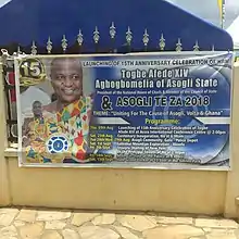 In 2004, Togbe Aƒede XIV brought back the celebration of the Yam Festival which had been abandoned for over a decade. With the goal of educating and entertaining both Ghanaians and visitors about Asogli traditions, the Yam Festival provides an opportunity for experiencing traditional music, dance, story telling and a grand durbar to end the festival.[4][5] Togbe Aƒede XIV has provided leadership in uniting many chiefs throughout the Volta Region and extending to other parts of Ghana and Togo. As a result, many of these chiefs attend the Yam Festival.