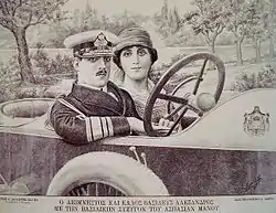Prisoner in his own kingdom, the young monarch took very badly the separation from his family. He regularly wrote letters to his parents, but they were intercepted by the government and his family didn't receive them.[15] Under these conditions, the only comfort of Alexander was Aspasia[16] and he decided to marry her despite the recommendations of his father and the opposition of the Prime Minister. Indeed, Eleftherios Venizelos, despite being previously a friend of Petros Manos (Aspasia's father), feared that she used her family connections to mediate between Alexander I and his parents.[17] Above all, the Prime Minister would have preferred that the monarch should marry Princess Mary of the United Kingdom to strengthen the ties between Greece and the Triple Entente.[lower-alpha 3][8]