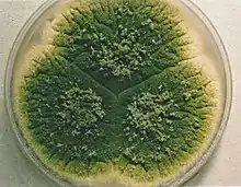 The conidia of A. parasiticus have rough, thick walls, are spherical in shape, have short conidiophores (~400 μm)[5] with small vesicles averaging 30 μm in size to which the phialides are directly attached.[3] A. parasiticus is further distinguished by its dark green colony colour.[2][1][7] Aspergillus parasiticus colonies are dark green. The average growth temperature for this fungus ranges between 12 and 42 °C with the optimum temperature for growth is at 32 °C and no growth reported at 5 °C.[3] Growth pH ranges from 2.4 to 10.5 with the optimum growth ranging between 3.5–8.[3] For the best growth of the fungus the carbon and nitrogen content in the soil is 1:1 and the pH 5.5.[8] A. parasiticus normally reproduces asexually[2] however, the presence of single mating genes MAT1-1 or MAT1-2 in different strains of the fungus suggests it has a heterothallic mating system and may have a hitherto unrecognized teleomorph.[2][4][7] A. parasiticus grows on cereal agar, Czapek agar, malt extract agar, malt salt agar, and potato dextrose agar. The sclerotia and stromata transform from white to pink, dark brown and black.[2] When grown on "Aspergillus flavus and parasiticus" agar (AFPA), colonies show an orange yellow reverse colouration.[3][9] The conidia are pink when grown on media containing anisaldehyde.[5]