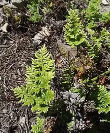 Aspidotis carlotta-halliae is a species of perennial fern known by the common names tufted lacefern and Carlotta Hall's lace fern. It is endemic to California,[2] where it is found in the Central Coast Ranges and coastal hillsides, often on serpentine soils. This species is a fertile hybrid between Aspidotis californica and Aspidotis densa. The fern was named for fern collector Carlotta Case Hall, who coauthored the 1912 botanical guide A Yosemite Flora with her husband, botanist Harvey Monroe Hall.[3]
