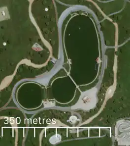 The lake is divided into three rounded sections. In the south, there are two circular divisions, and the north, an elliptical body composes 75% of the lake. The sections are divided by two bridges, the southernmost being composed mainly of wood, and the northern bridge being larger, higher and composed of stone. At certain intervals, a large fountain may start to spray water arching above the wooden bridge at many points.[2] The perimeter of the lake is barricaded with ropes, and there are two points in which the lake can be accessed via boats.[3]