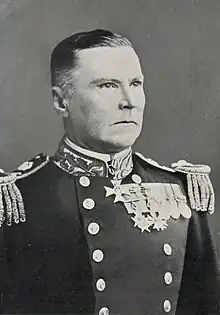 On 5 June 1902 he was appointed second-in-command of the Channel Squadron,[9] and temporarily hoisted his flag on board HMS Cambridge, gunnery ship at Devonport,[10] before he transferred to the battleship HMS Magnificent later the same month.[11] Shortly before his departure from London he was received in audience by King Edward VII.[12] With Magnificent, he took part in the fleet review held at Spithead on 16 August 1902 for the coronation of King Edward VII,[13] and visited the Aegean Sea for combined manoeuvres with the Mediterranean Fleet the following month.[14] Later the same year he was appointed a Commander of the Royal Victorian Order (CVO) in the November 1902 Birthday Honours list,[15] and was invested with the insignia by King Edward VII at Buckingham Palace on 18 December 1902.[16]