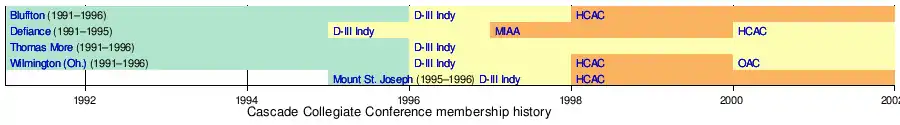 | Defiance College | Defiance, Ohio | 1850 | United Church of Christ | 1,000 | Yellow Jackets | 1991 | 1995 | D-III Independent (1995–97) Michigan (MIAA) (1997–2000) |